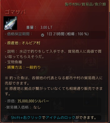 さて、100%だと35Mシルバーだった「ゴマサバ」でしたがおまけが乗って40Mほどで買い取ってもらいました。プレイできない時間帯での収入なのでこれはうれしいですね。
