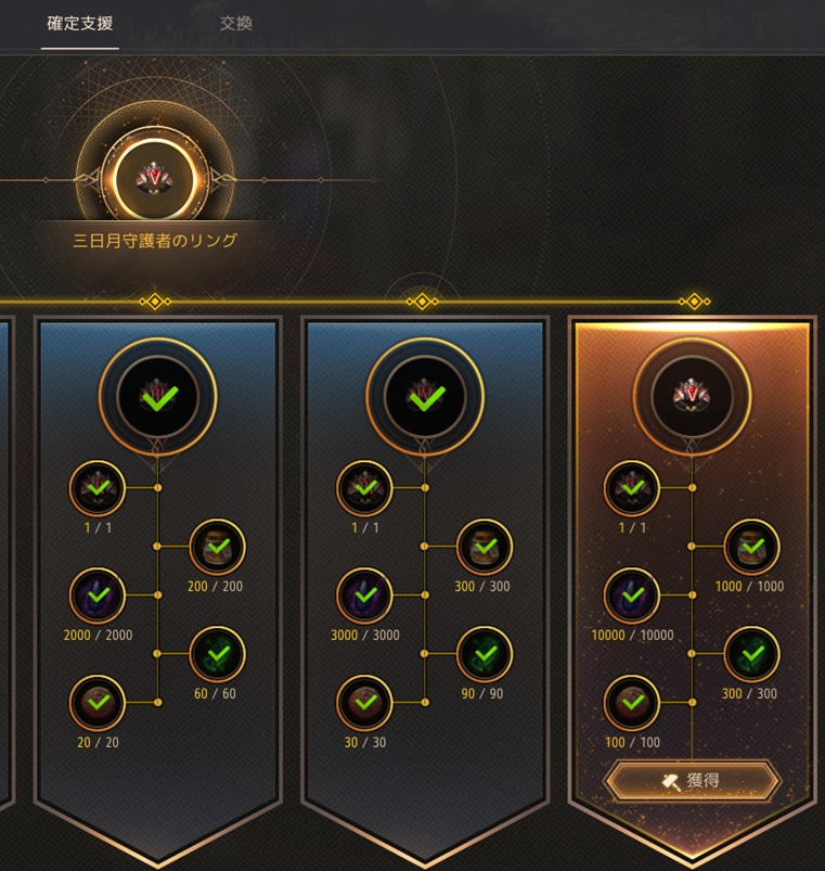 さて、シーズンVということで、目玉はカポティア装備ですが、あわせて強化材料ももらえています。これによりアクセサリー強化中だった「三日月守護者リング」のⅣ⇒Ⅴへの材料が確保できました。