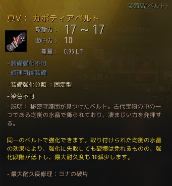 2025年秋の「シーズンV」によるクエストで手に入れたのは、「真5カポティア」装備。アクセサリ装備ですが自作は相当難しいです。